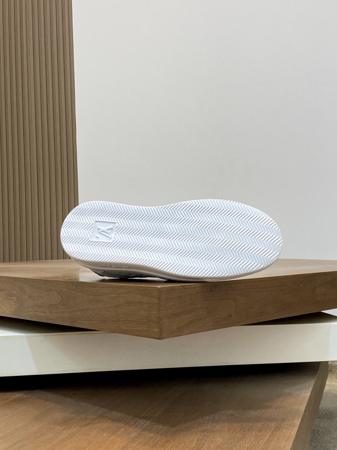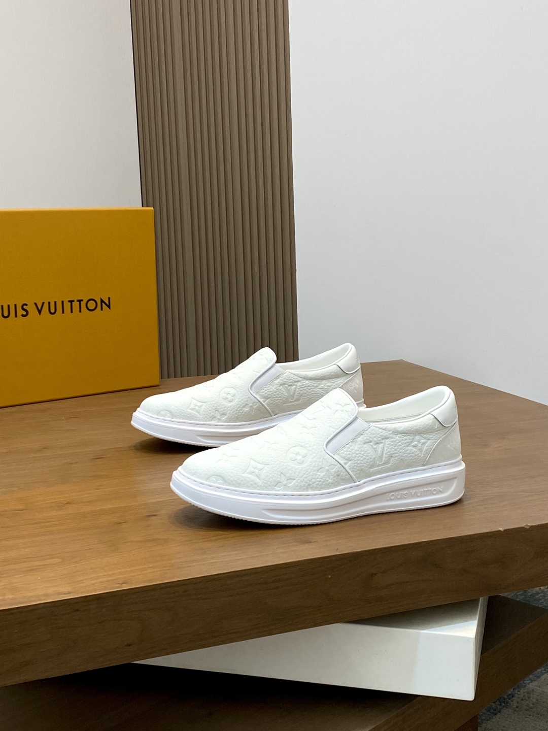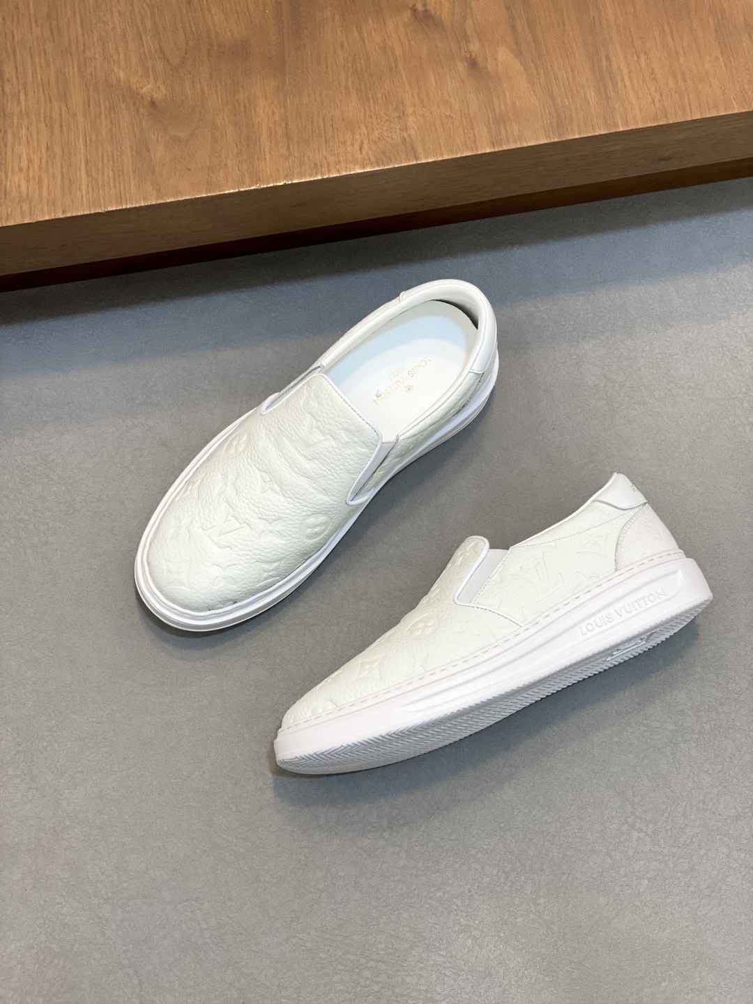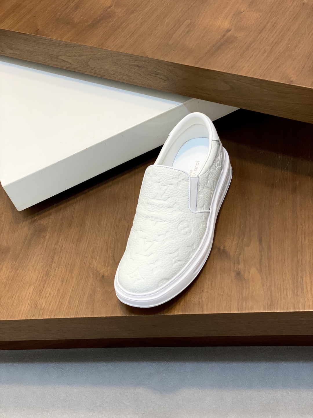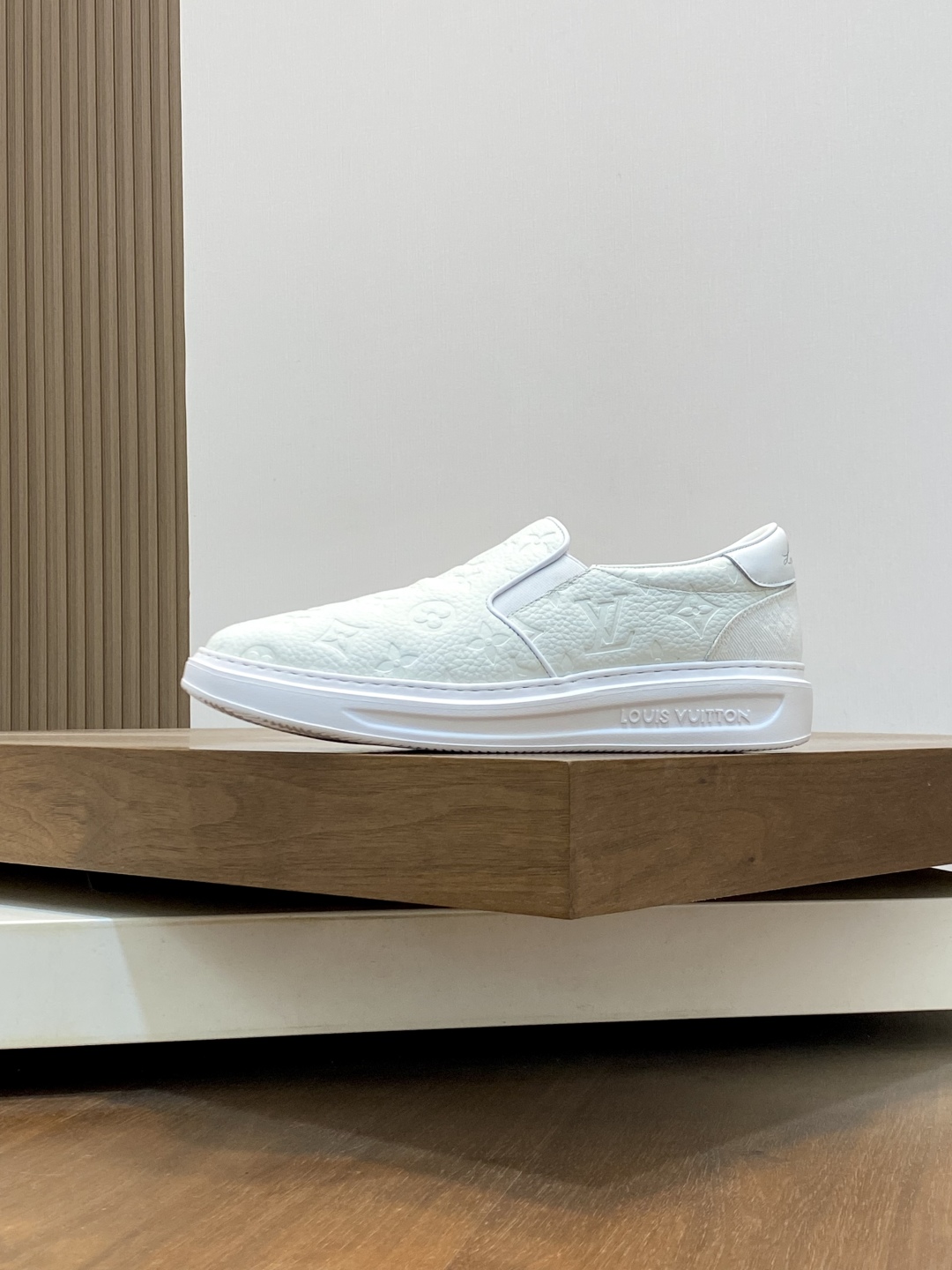 Step into luxury with these Louis Vuitton slip-on sneakers. Crafted from premium white leather with embossed detailing, offering superior comfort and style. Made in Italy.