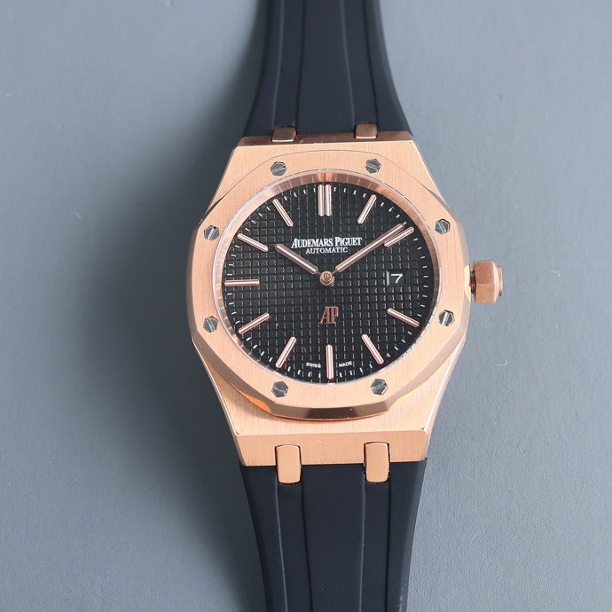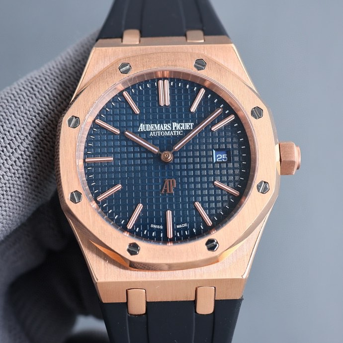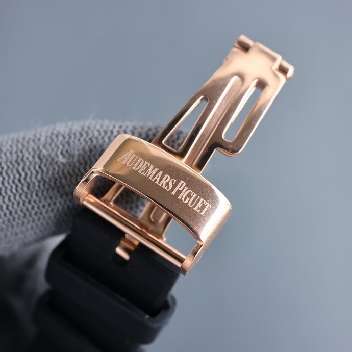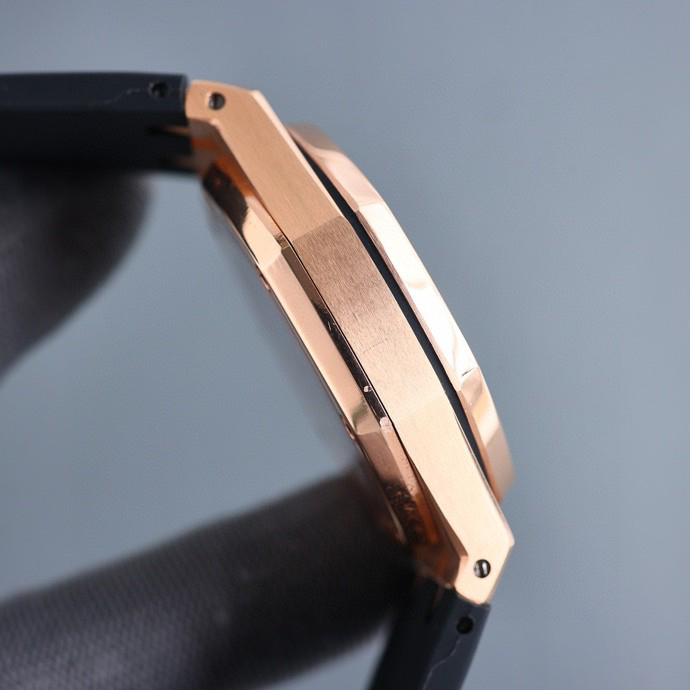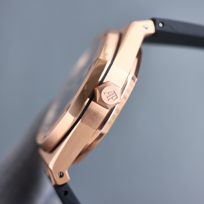 - Rose Gold Case: The elegant rose gold case showcases the unique octagonal design of the Royal Oak.