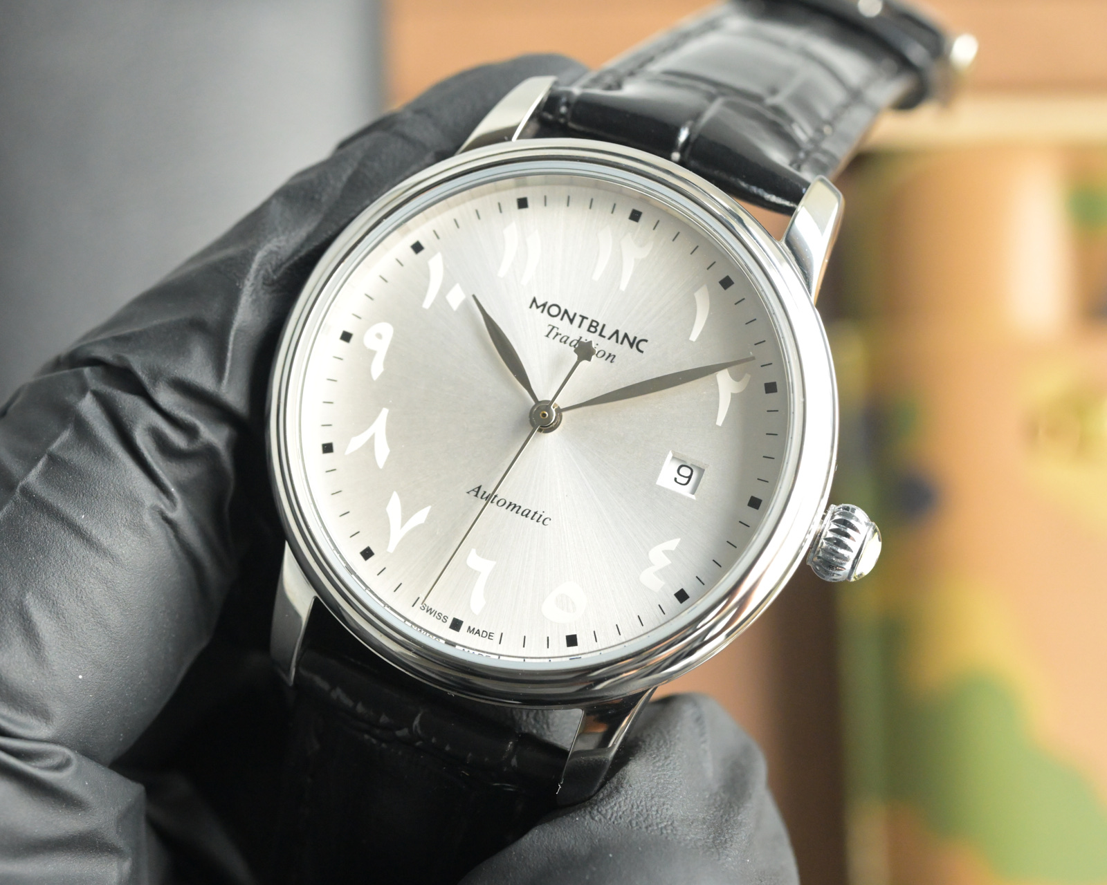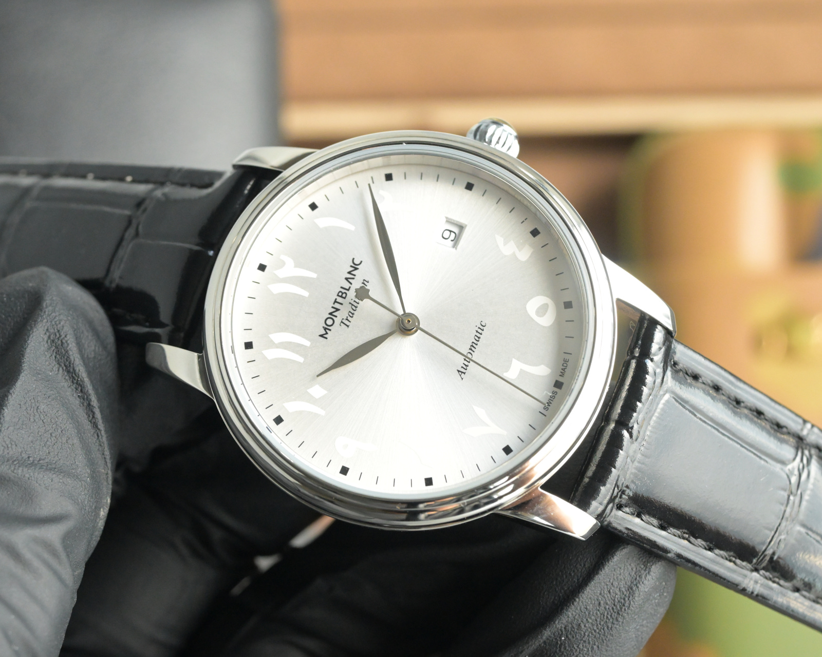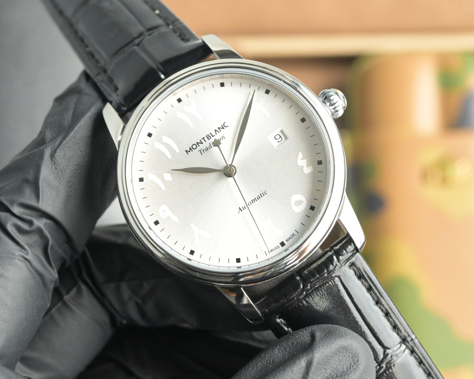 The Montblanc Tradition with Arabic numerals,40mm steel case, automatic movement, and black leather strap offers a timeless design.