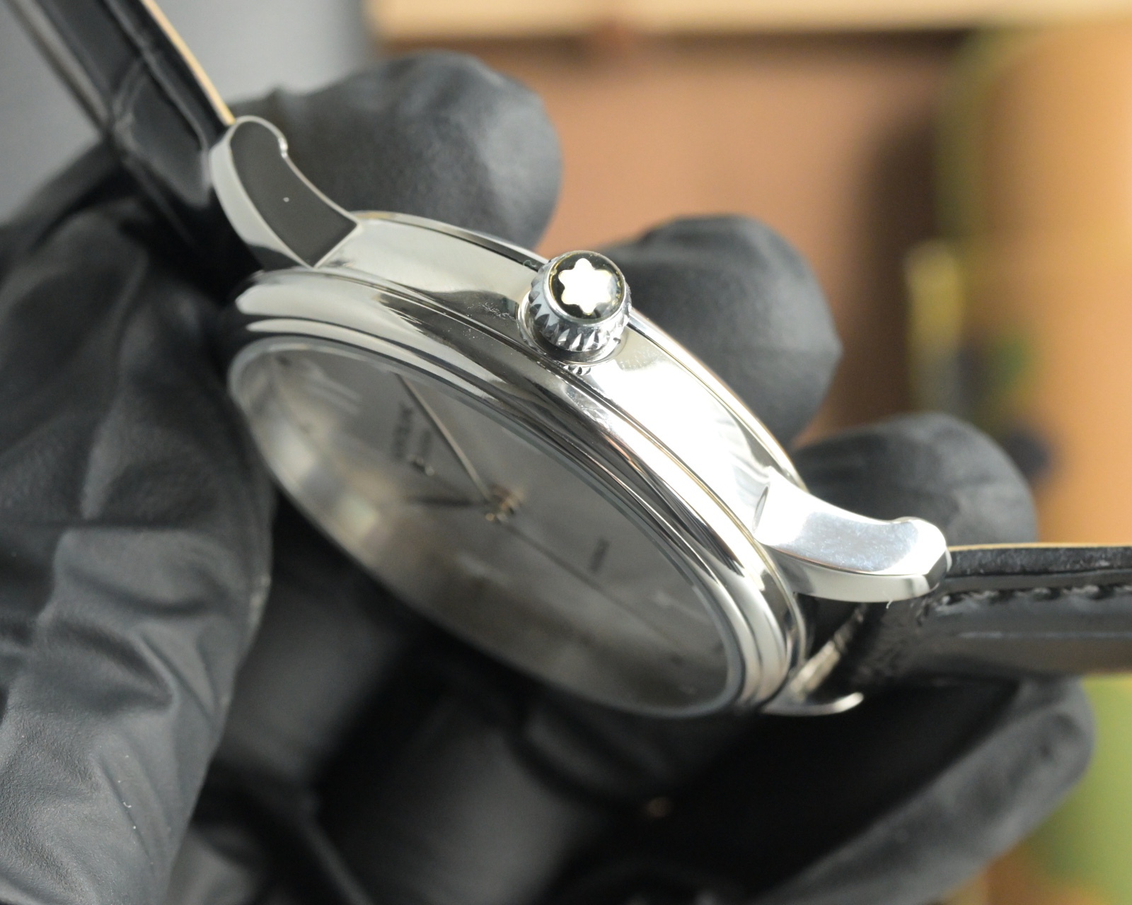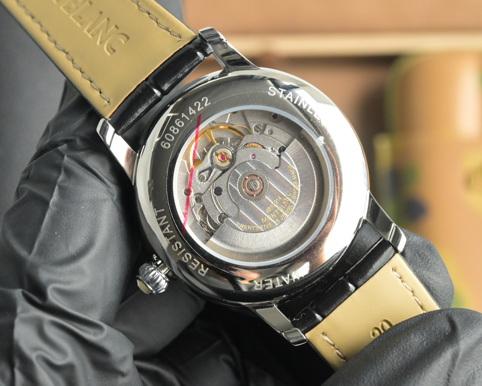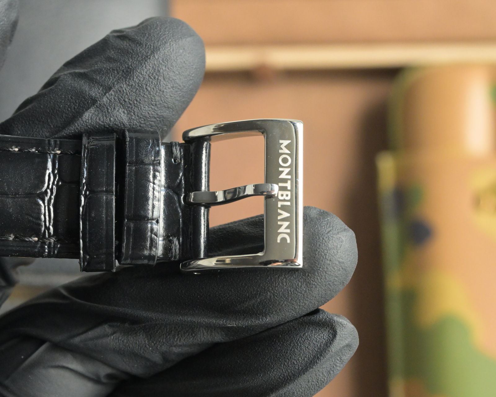 The Montblanc Tradition with Arabic numerals,40mm steel case, automatic movement, and black leather strap offers a timeless design.