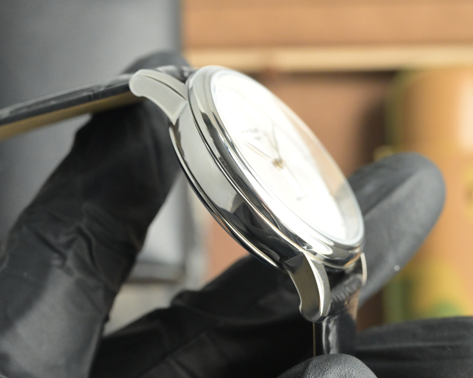 The Montblanc Tradition collection combines classic Montblanc design with a distinctive style. This watch features a clean silver dial with Arabic numerals, a stainless steel case, and a black leather strap, making it a versatile accessory for any occasion.